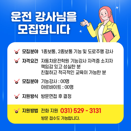 수강생과 함께 성장하는 운전학원, 함께할 선생님을 기다립니다!
